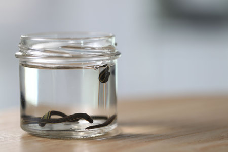 Leeches in glass jar on wooden table, closeup. Space for text