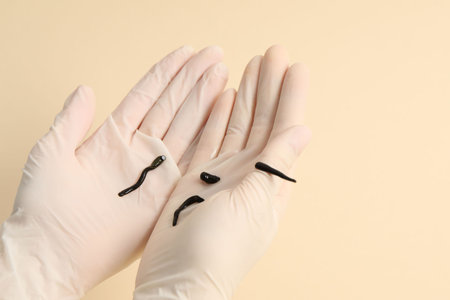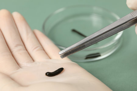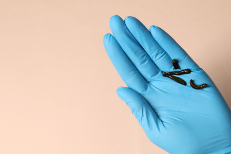 medical leech on the doctors gloved hand.