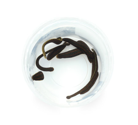 Medicinal leeches in plastic jar on white background, top view