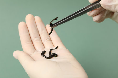 Woman holding medicinal leech with tweeters on green background, closeup
