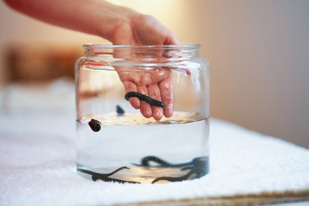 Doctor holding medical leeches. Hirudotherapy. Alternative medicine, bloodletting and rejuvenation of the body
