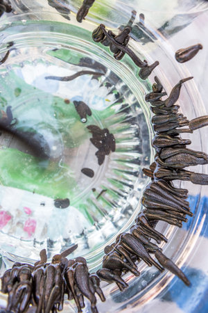 Many Medical leeches in a plastic bottle.Sucking leeches for veins cleaning in human body:procedure of hyrudotherapy,hirudotherapy(Medicinal leech therapy)
