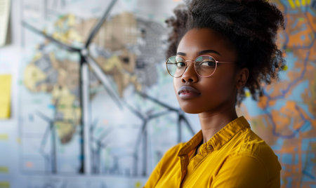A young African American woman creative engineer in glasses works in office of wind turbines. Female architect student working on project