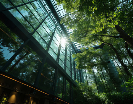 A captivating view of a modern glass building reflecting lush green trees, blending nature and urban design. The image showcases a serene atmosphere with vibrant colors.