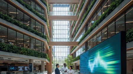 A modern corporate office designed with sustainability in mind, featuring extensive glass architecture, greenery, and innovative technology that harmonize with the environment.