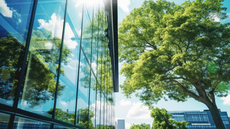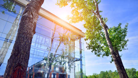 Eco architecture. Green tree and glass office building. The harmony of nature and modernity. Reflection of modern commercial building on glass with sunlight.