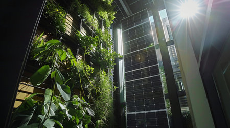 Modern sustainable building facade with solar electric panels and vertical garden with climbing green plants