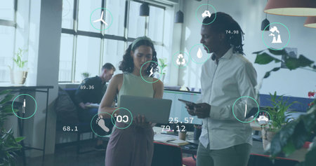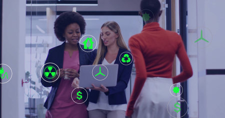 Walking three colleagues discussing work in office corridor, with laptop, coffee mug, digital icons. Teamwork, collaboration, innovation, sustainability, technology, professionalism, diversity