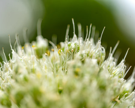 White umbrella flower of Allium Sepa or Onion. Sprouting unripe seedlings of Onion. White bus flower closeup with green filament.