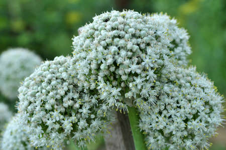 Blooming onion flower head in the garden. agricultural background. Spring onions or Sibies. summertime rural scene. White flowers. Allium.