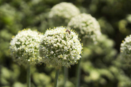 blooming onion plant in garden. Closeup of white onions flowers on summer field. selective focus.