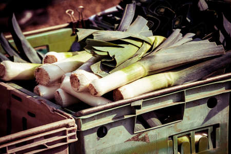 Freshly picked leek in box. Harvest. Harvesting. Agriculture and farming. Agribusiness. Agro industry. Growing Organic Vegetables. Selective focus
