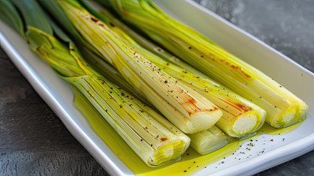 High-quality photo of Turkish leek with olive oil (Zeytinyagli Pirasa), served on a white plate