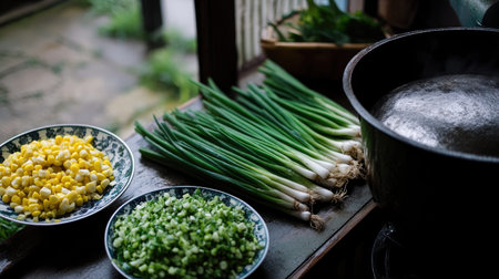 A rustic kitchen scene featuring freshly cut spring onions and sweet corn arranged in bowls, perfect for illustrating the joys of home cooking and healthy meal prep.