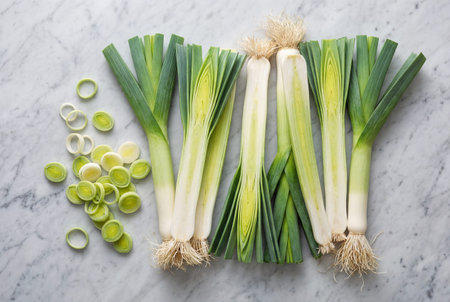 Fresh leeks halved lengthwise with sliced rings on grey marble surface in top down view ideal for culinary preparation recipe inspiration and vegetable texture appreciation