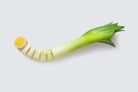 Minimal flat lay looking leeks view during slice progress over white, indludes copy space.