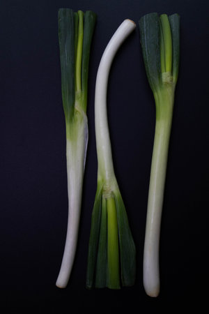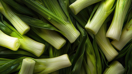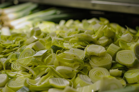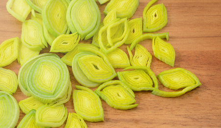 Closeup of freshly sliced vibrant green leeks. Organic and healthy vegetables. Perfect for vegetarian food preparation and culinary arts