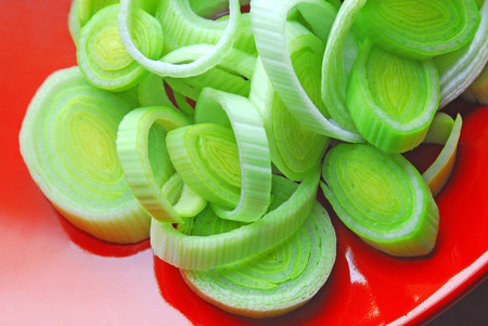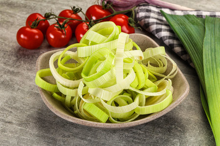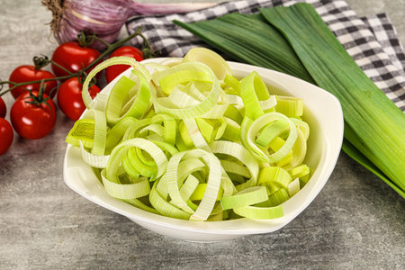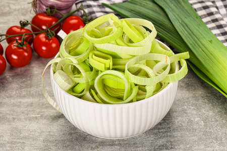 Fresh ripe green leek slices in the bowl