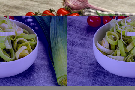 Cooking healthy food. Sliced and chopped leek on abstract colorful background, top view, copy space