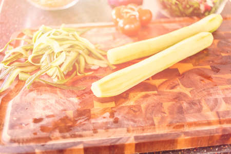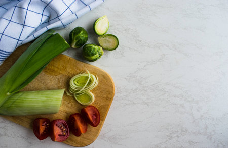 Sliced ??vegetable pieces on a cutting board, background with copy space