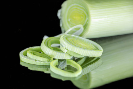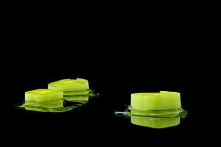 Close-up of slices of chopped leek, isolated in front of a black background