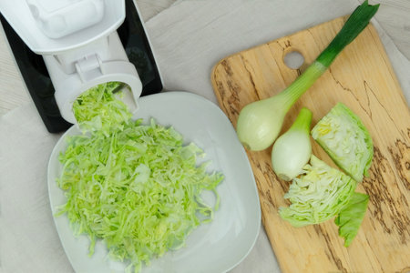 Сabbage in a vegetable cutter on kitchen table. Chopped cabbage is falling into a bowl. Homemade healthy food.