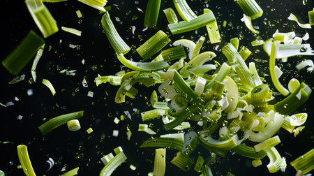 The green juicy leek is cut into pieces and floats in the air on a white background. A natural organic product. Food background. An ingredient for salads. Celery is cut into pieces. Diet