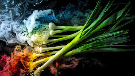A bunch of leeks lies on a black table surrounded by magical red-white-blue smoke. Green onions are a delicious and healthy vegetable. A natural product. Healthy eating. food background