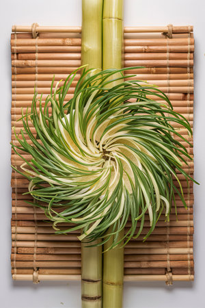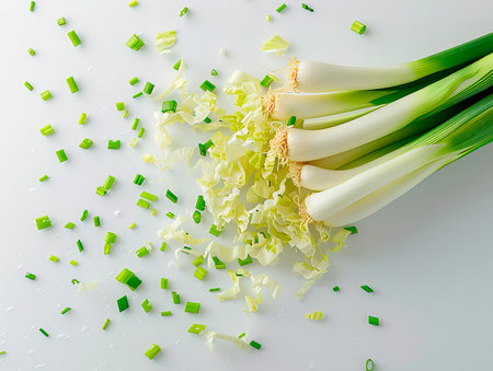 An artistic arrangement of fresh green onions and leeks on a white surface, highlighting vibrant colors and textures ideal for culinary inspiration and food photography.