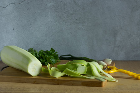 Zucchini, onion and garlic on wooden cutting board on grey background