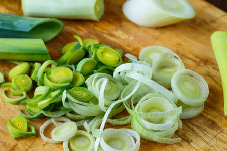 Fresh sliced leeks on a wooden board.