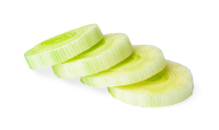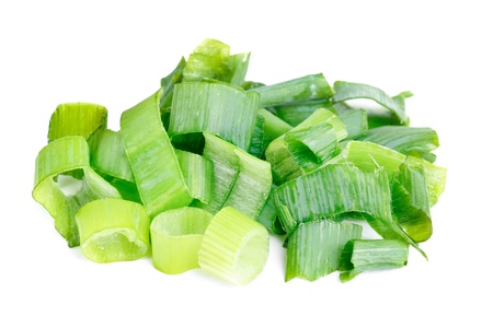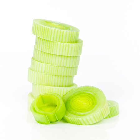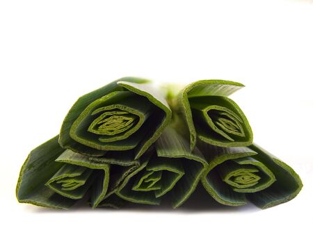 Green fresh leeks sliced on the white background. Isolated