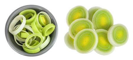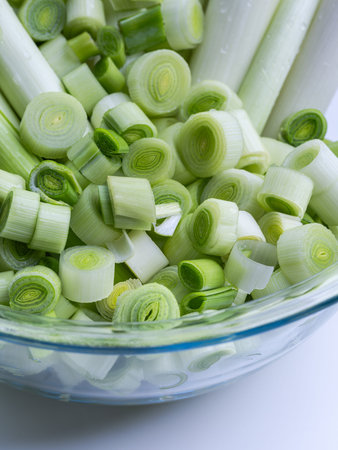 Fresh Sliced Leeks in a Glass Bowl on White Backgroun