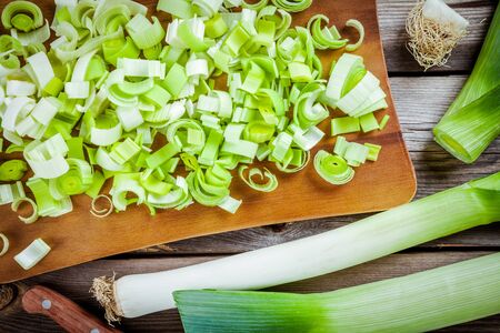 Fresh leek cut into small pieces on wooden board