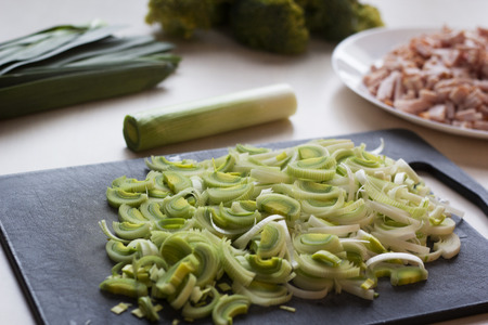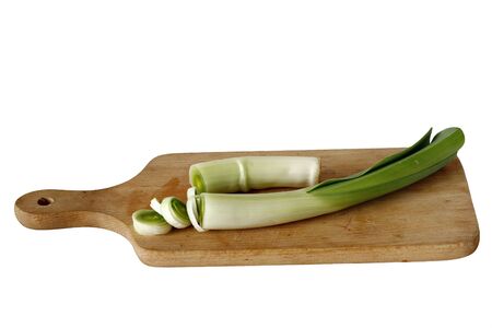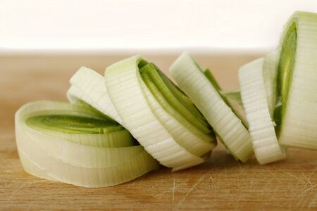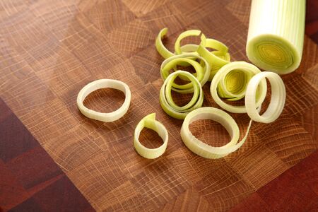 Fresh sliced leeks on a wooden bread board