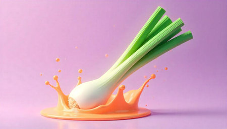Leek splashing in orange liquid against pastel background