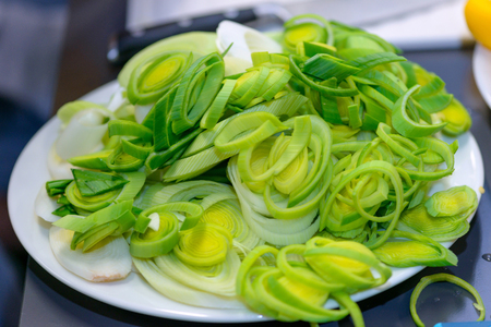 fresh green leek vegetable chopped on plate
