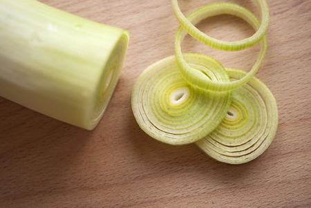 fresh cut leek closeup onwood background