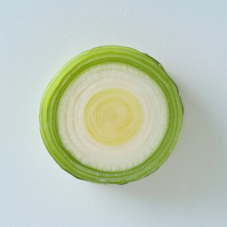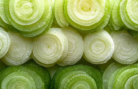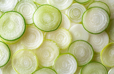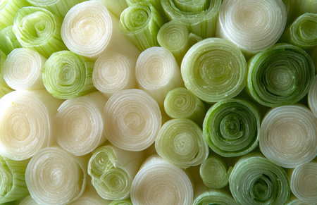 Freshly sliced leek rings arranged in a layered circular pattern, showcasing vibrant green and white tones