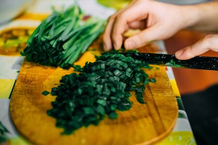 Chopped green onion on a cutting board. Selective focus.