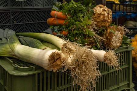 Fresh organic vegetables displayed on a market stand, including leeks, carrots, celery root and potatoes. Healthy natural ingredients for cooking, homemade broth and traditional cuisine. Ideal concept for organic farming, vegetarian food, and healthy lifestyle.