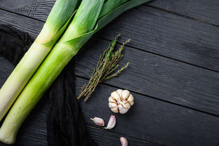 Organic Leek onion Stalks on black wood background with herbs ingredients for coocinh , top view with space for text