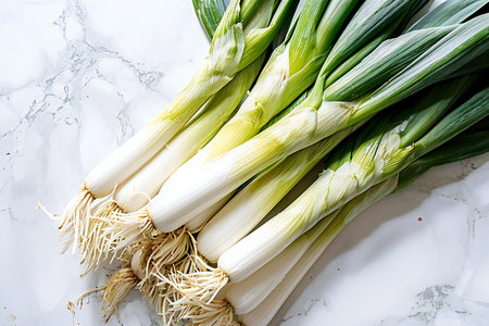 Several fresh leeks with vibrant green tops and white roots are gathered together on a clean white surface. Perfect for adding flavor to a variety of selectable meals.