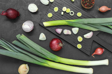 Whole and cut fresh leeks on a dark background, vegetarian food, healthy eating. Top view.