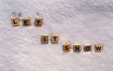 Let it snow phrase on a white clean snow. Let it snow is written on a snow with wooden letters.