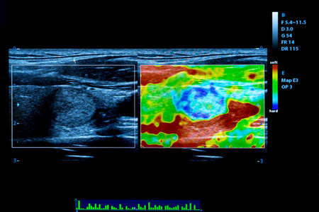 Colourful image of modern ultrasound monitor. Ultrasonography machine. High technology medical and healthcare equipment. Ultrasound imaging or sonography used in medicine.