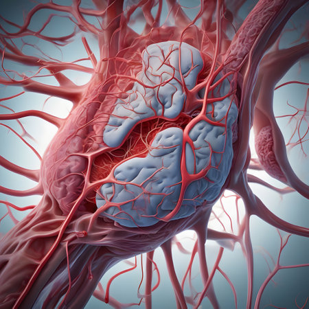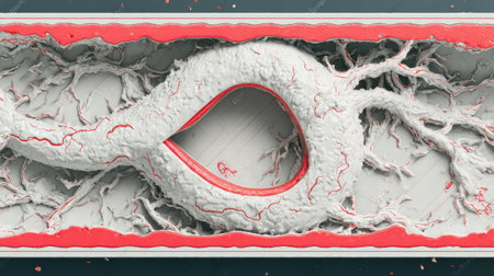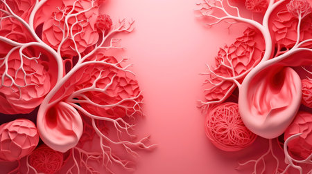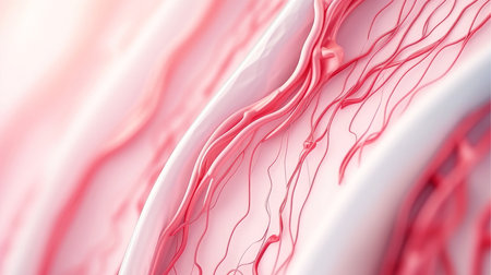 A detailed view of red blood vessels intertwines across a soft gradient background. The intricate network showcases the complexity of human circulation highlighting the various sizes and shapes of the vessels