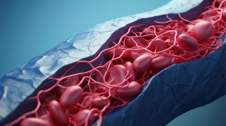 Human blood vessel with red blood cells. 3D medical illustration.