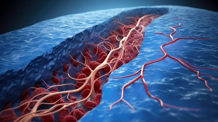 Detailed visualization of intertwined red capillaries resembling a biological network, set against a dark blue backdrop