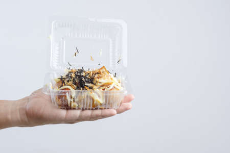 Hand holding pack of Takoyaki, a flour ball filled with octopus, Japanese street food on white background